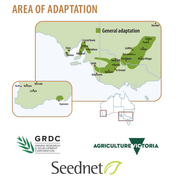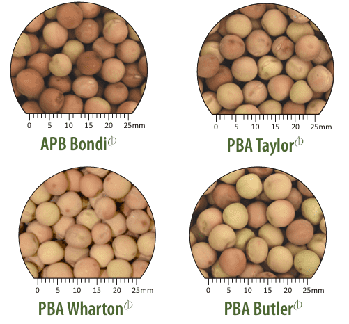 APB is a high-yielding ‘Kaspa type’ with a mid-flowering and mid-maturity. It has a high level of tolerance to high soil boron and is moderately tolerant to high salinity. It has an erect, semi-leafless plant type. A broad adaptation across all the cropping regions with consistently high grain yield, up to 5-10% higher yielding than previous kaspa-types PBA Tayor and PBA Butler. The disease package is MS for Blackspot, S for Bacterial Blight, R-MR for Downy Mildew, and R for Powdery Mildew. It also has resistance to pea seed borne mosaic virus and bean leaf roll virus.