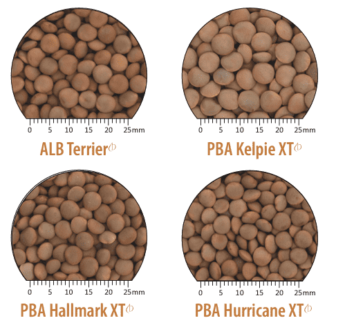 ALB Terrier lentils are a new release out of the Australian Lentil Breeding program; it comes with imi-tolerance and good early vigour. ALB Terrier is a mid-flowering and mid-maturity variety. It has an improved boron tolerance to some of our other varieties and high resistance to root lesion nematodes. Early disease ratings are R for Nipper Ascochyta blight, MR(p) for Hurricane Ascochyta blight, and MRMS(p) for botrytis grey mould (BGM).