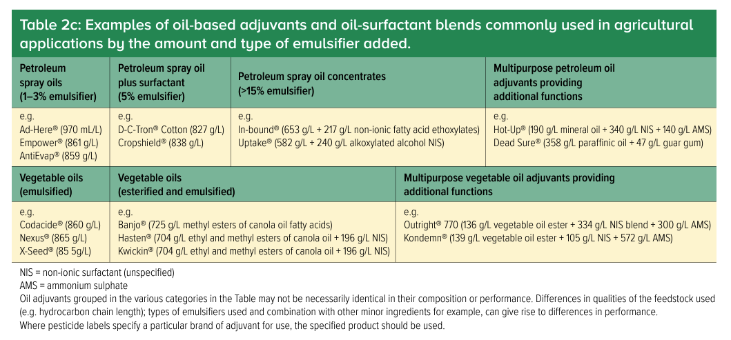 - Vegetable oils (emulsified) are not commonly used in broadacre cropping due to their viscosity and risk of phytotoxicity. Products include Nexus, a pure canola oil.