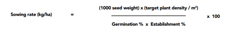 This equation does consist of a few assumptions. Targeted plant density for high-performing pastures is based on broad recommendations, with suggestions of 400 plants/m2, but this may require 500 plants to be sown. Where multiple species will be sown together, guidelines suggest proportioning the seeding rate at 40% of the monoculture rate (160 plants/m2). Over-sowing rates into an existing pasture are usually around 50 – 75% of the full sowing rate, depending on residual plant densities. The industry standard for seeding rate is 85%, but keep in mind poorly grown or stored seed will have reduced viability.