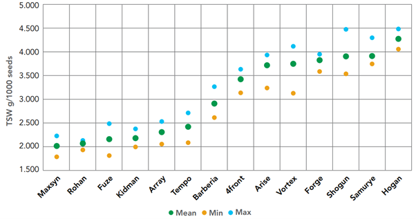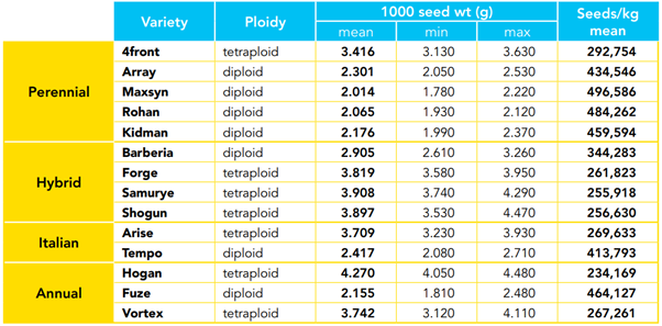 Below are two graphs from Barenbrug, a trusted seed supplier, who have meticulously examined their ryegrass varieties and their seed sizes for the 2024 season. This data demonstrates the significant variation that can occur within a single variety, similar to what you see with canola seed.