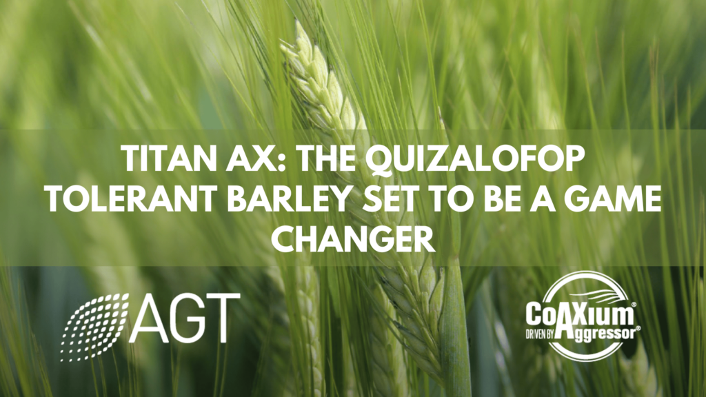 Australian Grain Technologies (AGT) has released Titan AX barley! It’s the first barley variety in the world that offers tolerance to Aggressor (a Group 1, Quizalofop-P-Ethyl herbicide). This means you’ll get in-crop control of susceptible populations of barley grass, brome grass, annual ryegrass, wild oats and other grass weeds in your barley phase of the rotation.